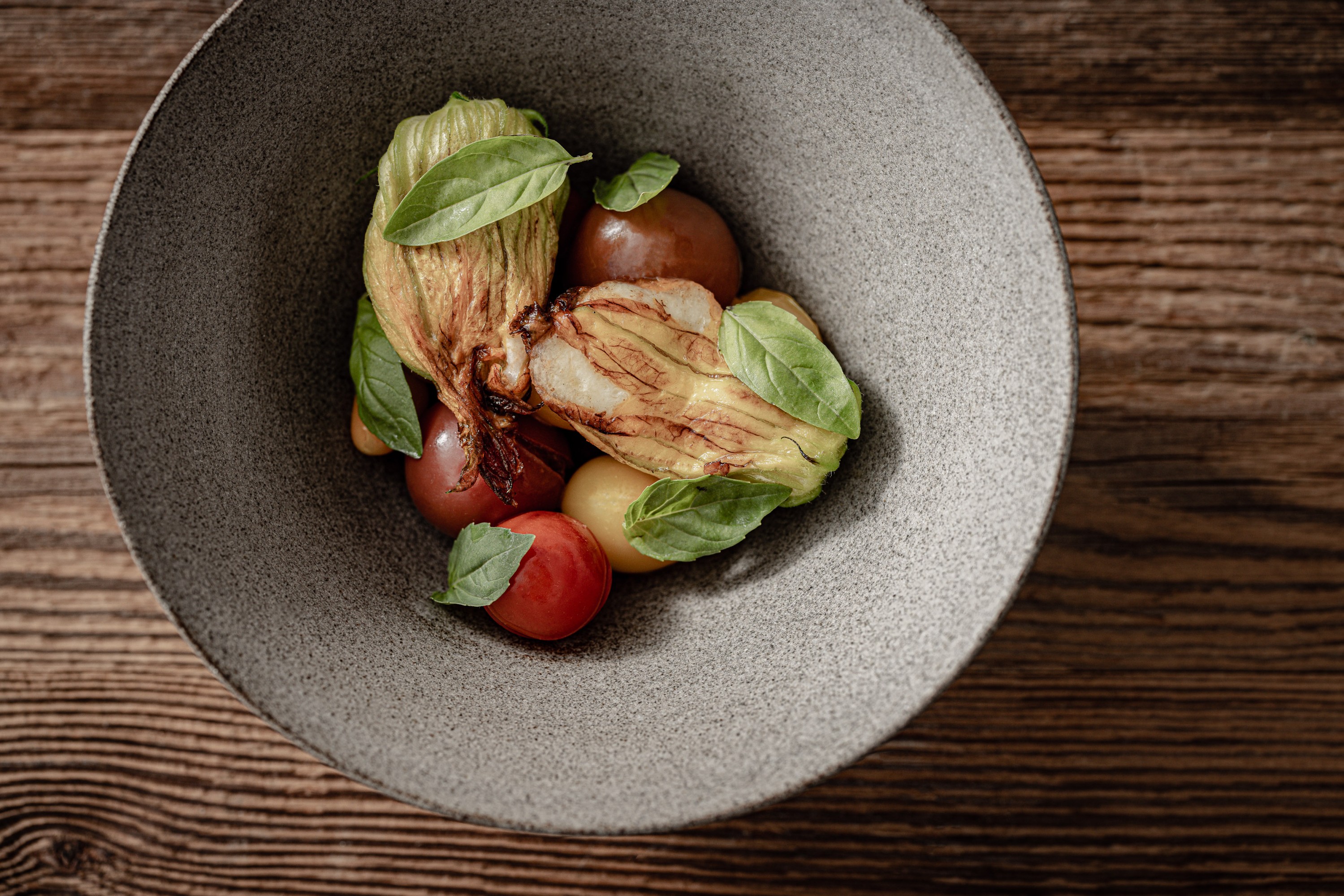 Feine Zucchiniblüten gefüllt mit aromatischem Heumilch-Mozzarella, serviert auf buntem Tomatensalat mit Basilikum – ein kreatives Sommergericht voller Finesse, Frische und natürlichem Geschmack.