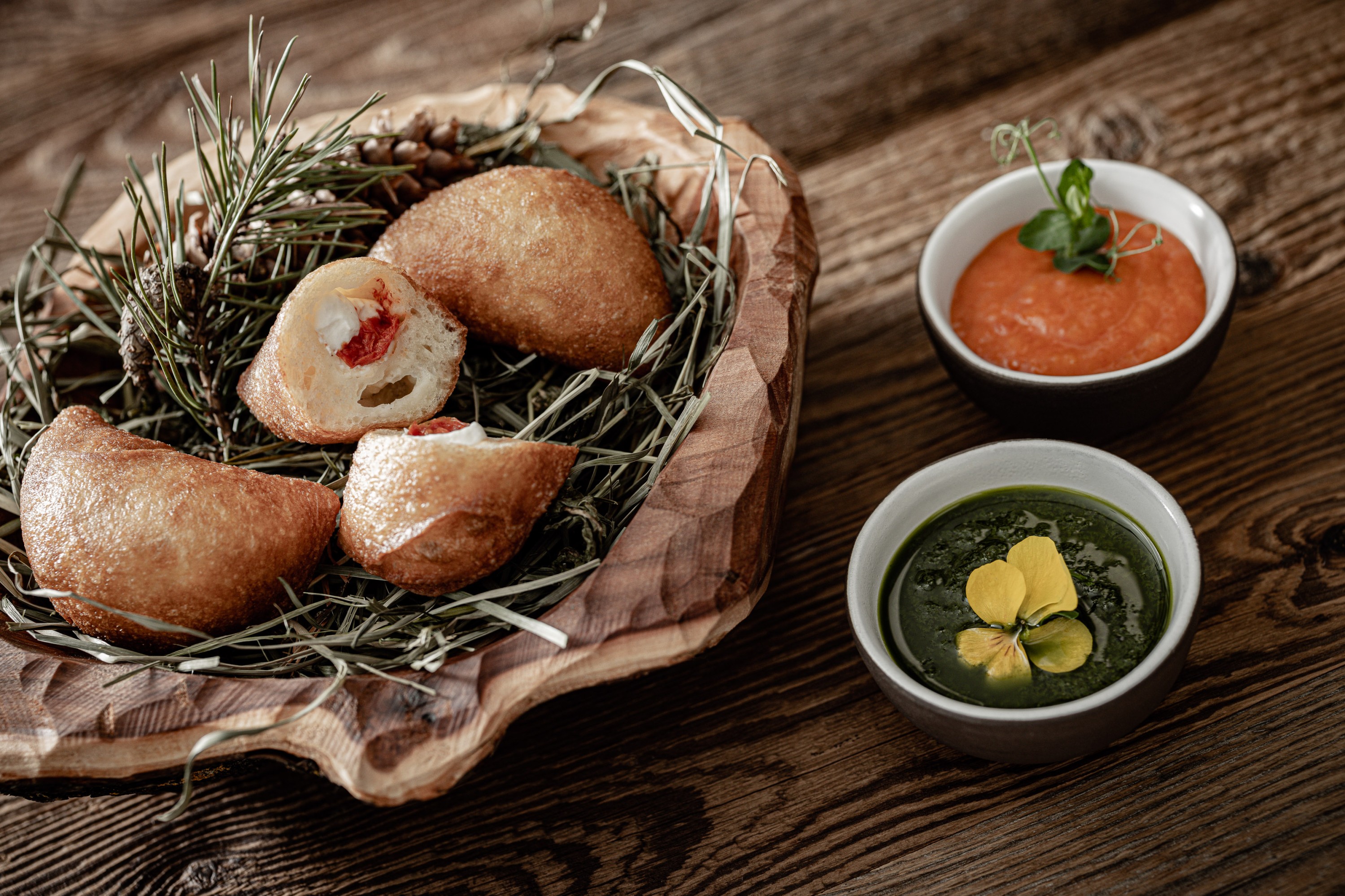 Die Panzerotti noch warm mit verschiedenen Dips zum Beispiel Basilikum Pesto oder Tomaten Chuntey servieren.